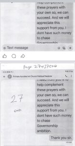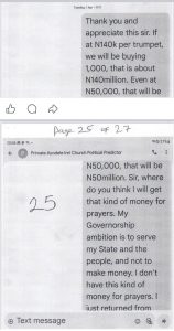 Shortly after the petition became public, screenshots of what appear to be text exchanges between the two men began circulating online. In the alleged messages, Ayodele reassures the minister that his intentions were spiritual guidance, not financial gain, and urges Adelabu to focus on prayer and divine favor. One message reads: “Seek God’s mercy and let your heart be steadfast — not wealth.” Another purported reply from the minister indicates frustration over the cost and relevance of the requested items.