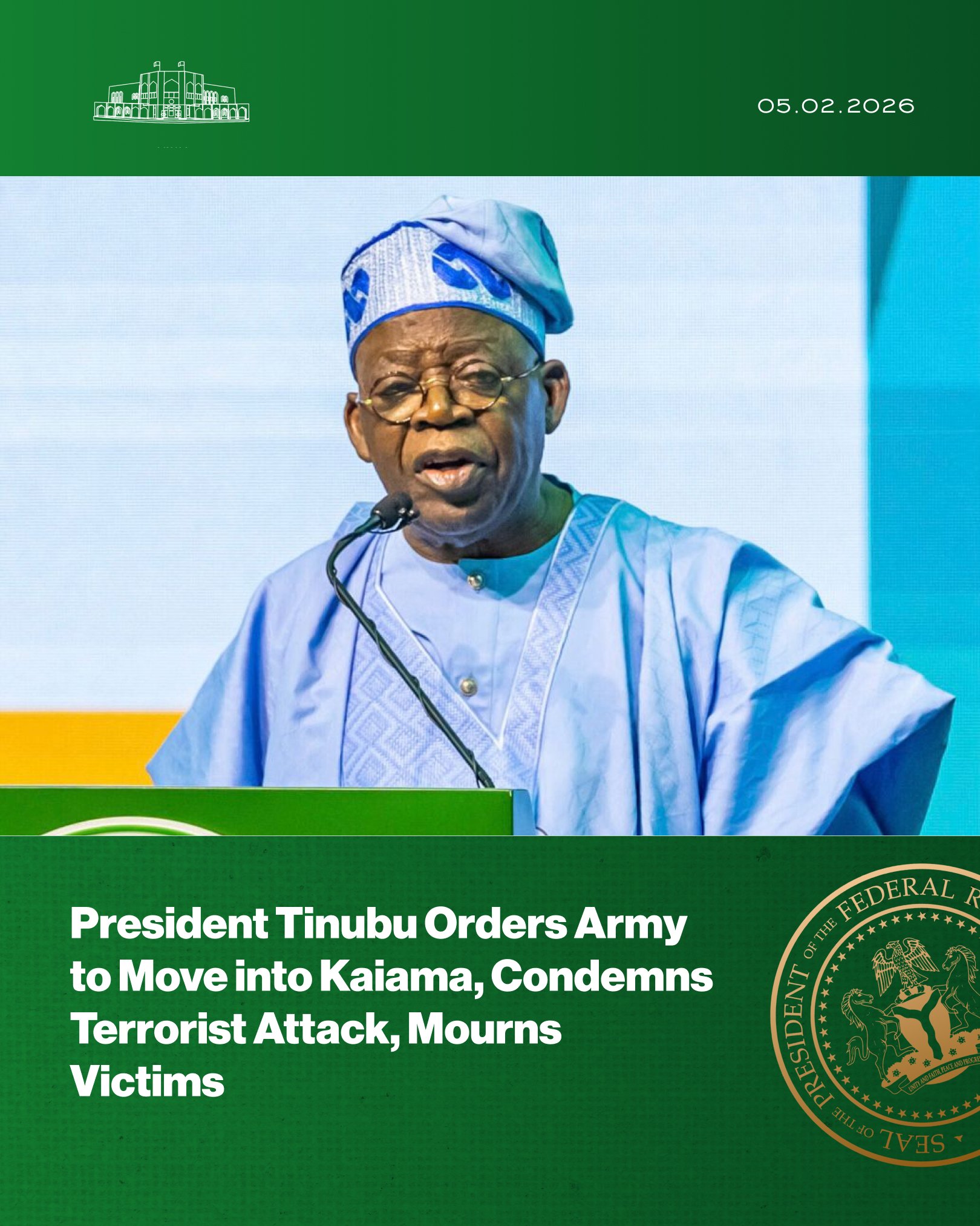 ‎Heaven Gates Open: President Tinubu Expresses Outrage Over Terrorists Attack; Commands Army to Move into Kaiama, Orders Death on Barbaric Insurgents