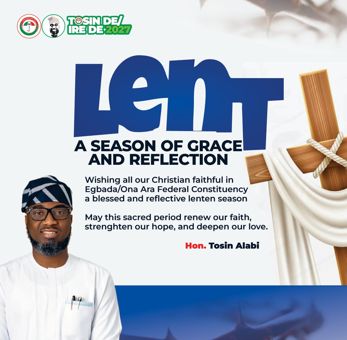 A leading hopeful of the House of Representatives for Egbeda/Ona Ara Federal Constituency, Hon. Tosin Alabi, has extended warm greetings to Christian faithful across the constituency as they commence the sacred season of Lent.