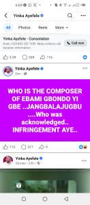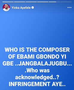 In a post shared on his verified social media page, Ayefele wrote: WHO IS THE COMPOSER OF EBAMI GBONDO YI GBE… JANGBALAJUGBU… Who was acknowledged..? INFRINGEMENT AYE..”
