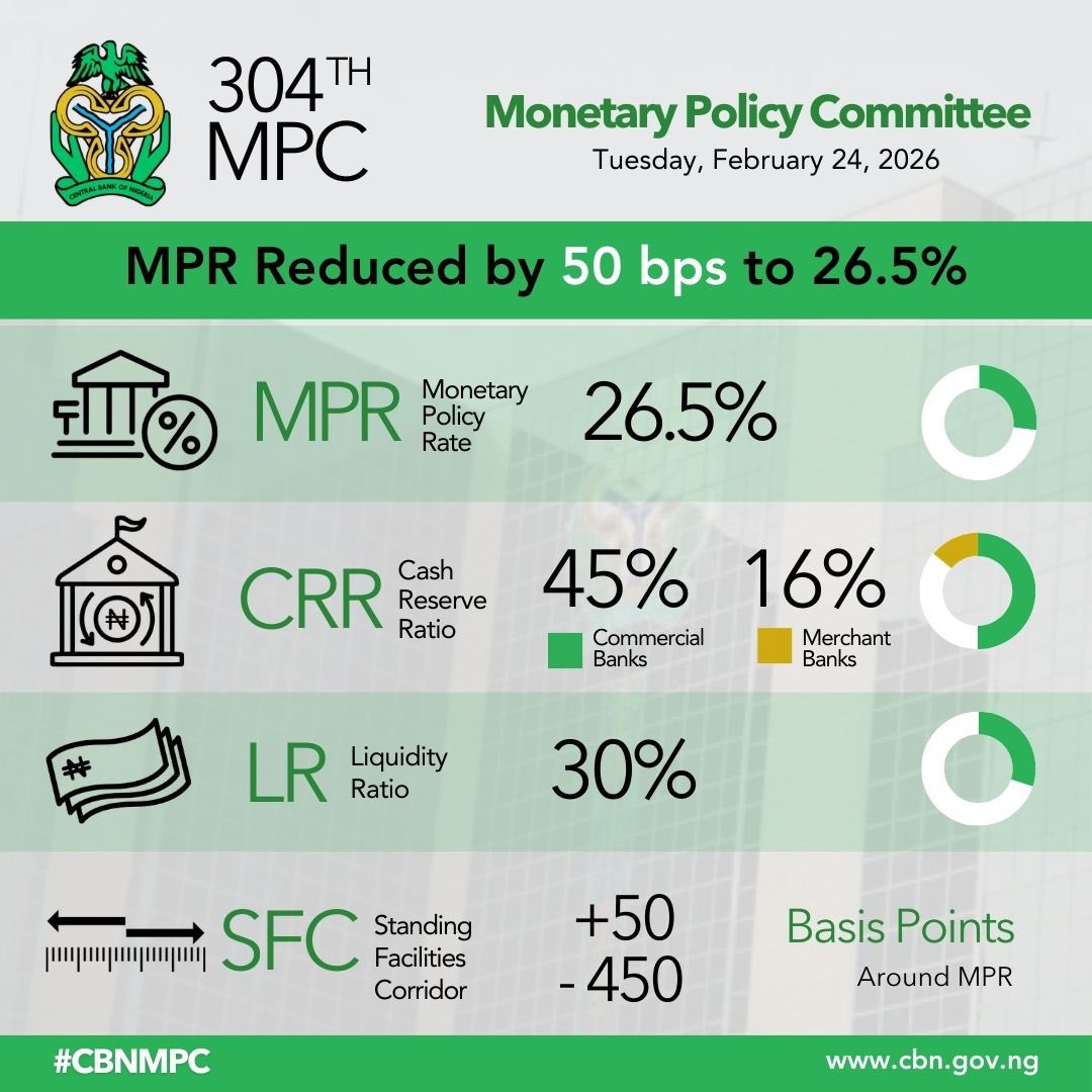 The Central Bank of Nigeria (CBN) has reduced the Monetary Policy Rate (MPR) by 50 basis points to 26.5 percent, signaling a measured shift in its monetary policy stance. The decision was announced at the end of the 304th meeting of the Monetary Policy Committee (MPC) held on Tuesday, February 24, 2026.