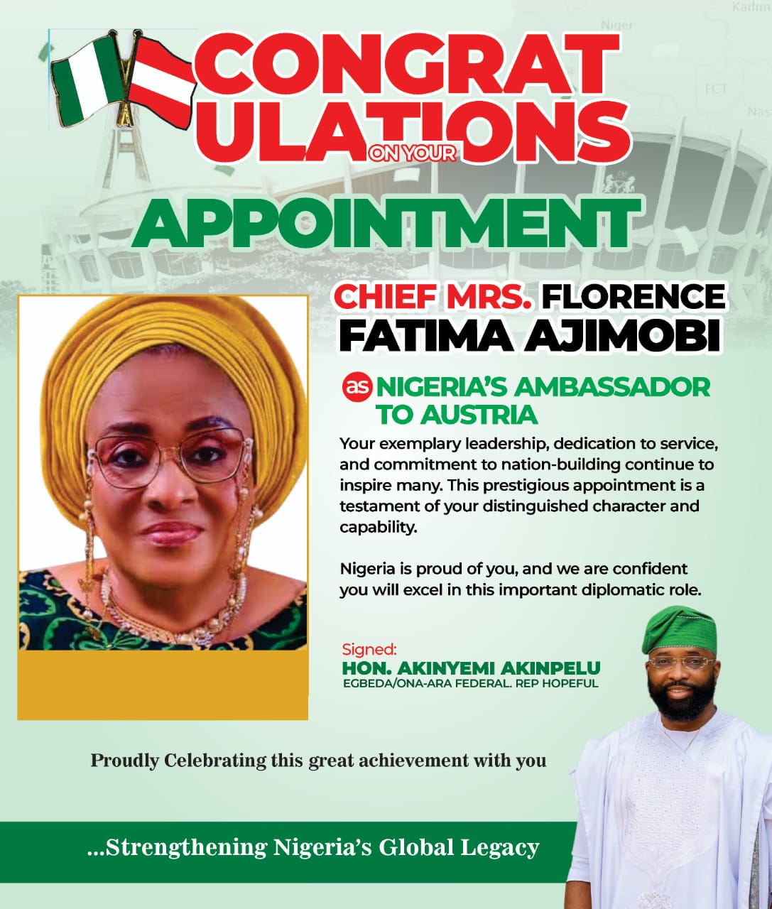 A leading aspirant for the Egbeda/Ona-Ara Federal Constituency seat in the House of Representatives in the forthcoming 2027 general election, Hon. Akinyemi Akinpelu, has extended warm congratulations to former First Lady of Oyo State, Chief Mrs. Florence Fatima Ajimobi, following her appointment as Nigeria’s Ambassador to Austria.