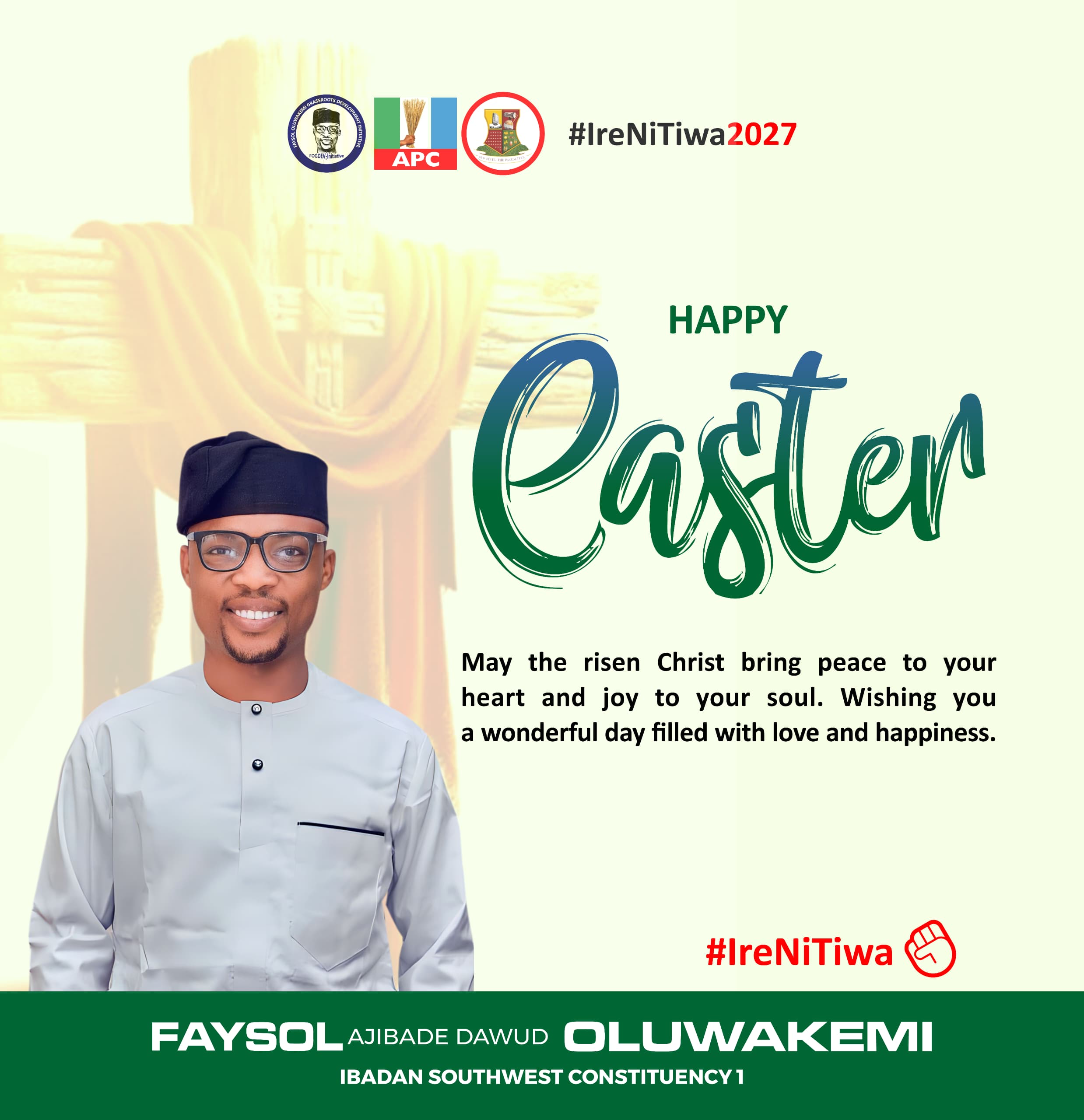 An Oyo State House of Assembly hopeful for Ibadan Southwest Constituency 1, Hon. Faysol Oluwakemi, has extended warm Easter greetings to Christian faithful in Ibadan Southwest Constituency 1, Oyo State and across Nigeria.