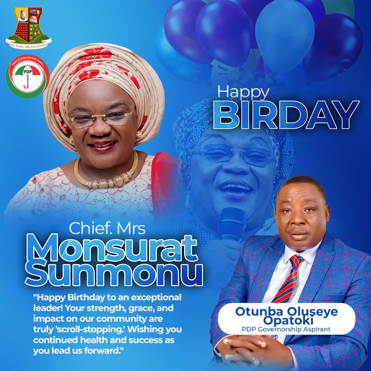 On this special day, Otunba Oluseye Oladosu Opatoki joins the people of Oyo State in wishing Senator Monsurat Olajumoke Sunmonu a happy birthday, good health, and continued success in all her endeavors.