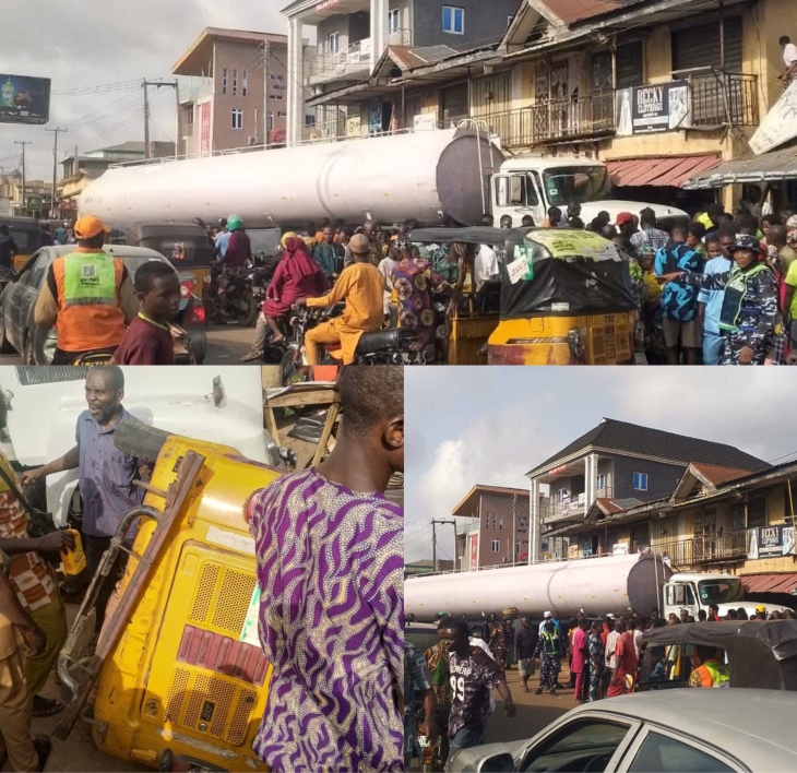 A fuel-laden tanker was involved in a serious accident this morning at about 9:00 a.m. in the Oke-Ado area of Ibadan, Oyo State, when it lost control and crashed into several roadside shops.