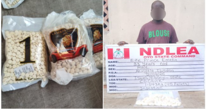 In Oyo State, NDLEA officers intercepted a commercial bus along the Ibadan/Oyo Expressway and arrested a passenger, Eze Prince Emeka, who had ingested illicit drugs. Under observation, he excreted 45 wraps of cocaine weighing more than one kilogram. Investigations revealed he intended to smuggle the drugs to Europe via trans-Saharan routes, using Algeria as a transit point.